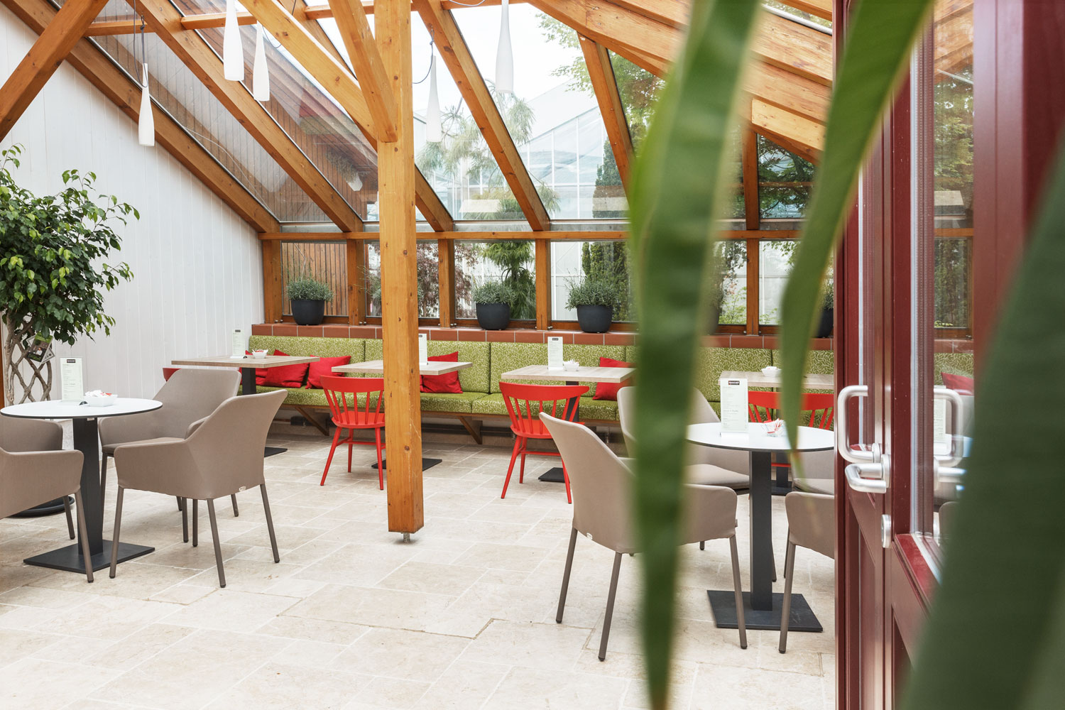 Helle Farben und freundliche Möbel umgeben von Blumen und Bäumen. Hier will man bleiben und so soll es ja sein.