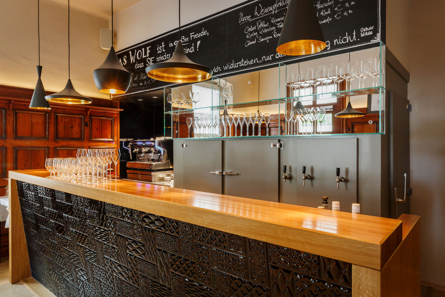Ein traditionsreiches Restaurant braucht das entsprechende Ambiente. Die einzelnen Bereiche wurden erneuert bzw. an den Altbestand angepasst und durch den Einsatz unterschiedlicher Oberflächen akzentuiert, das verwendete Holz auf unterschiedliche Weise veredelt, etwa gebeizt, gekalkt oder lackiert.